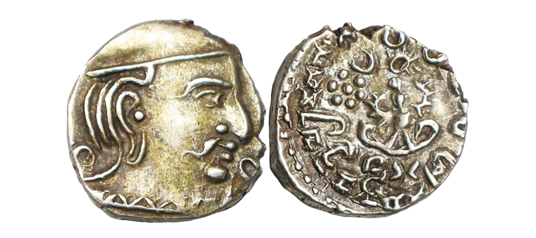 Ancient, Guptas, Kumaragupta (415-455 AD), Silver Dramma, 2.01 gms, Obv. Bust of king to right, Corrupt Greek legend around, Rev. Stylized Garuda at center, Brahmi script around reading “ParamabhagavataMaharajadhiraja Sri KumaraguptaMahendraditya”, very fine+, very scarce.