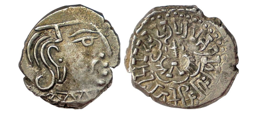 Gupta Empire, Kumaragupta I (409-455 AD), Silver Dramma, 2.14 gms, Obv: Bust of king to right, Rev: Stylized Garuda at centre standing facing with wings spread, Brahmi legend around reading ‘Paramabhagavata Maharajadhiraja Shri KumaraguptaMahendraditya’, Pieper # 3562, very fine+, scarce