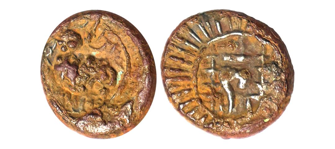 Ancient, Later Pallavas, Vishnukundin Fabric, Copper Base Alloy Unit, 2.30 gms, Obv. Bull Standing facing right with Srivatsa & Crescent, with dotted border, Rev. Conch flanged by two stylised tridents, very fine, rare.