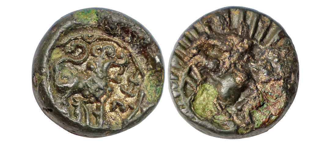 Eastern Chalukyas of Vengi (6th Century AD), Copper Unit, 0.67 gms, Vishnukundin type, Obv. a roaring lion standing facing the left with one foreleg raised, its tail curled towards its back, Rev. Srivatsa & linear border with serrations around the field, unlisted type, fine, very rare.