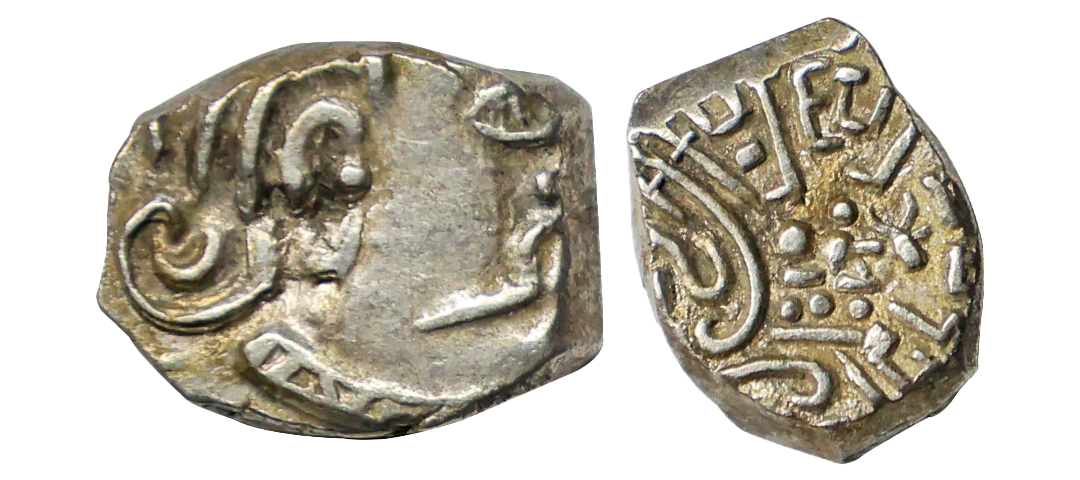 Ancient, Kalachuris of Mahismati, Krishnaraja (550-575 AD), Silver Dramma, 2.09 gms, Obv. Portrait of king to right, Rev. Bull to right at center, partial Brahmi legend around reading as ‘ParamaMaheshwaraMatapitraPadanudhyataShriKrishnaraja’,Pieper #3679, very fine, very scarce.