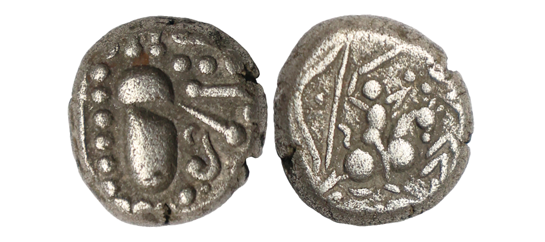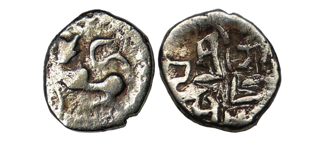 Amirs of Multan, Amir Muhammad-II (Late 8Th Century), Silver Bilingual Damma (Qanhari Dirham), 0.55 gms, NM, ND, Obv. Mihira Deva in nagari, Rev. Three Dot motif with brahmi legends Sri Ta Pa, about very fine, very scarce.