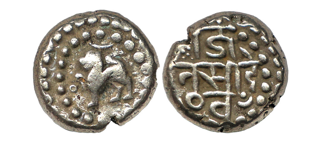 Medieval, Chauhans Of Ranthambor, King Jaitra Simha (c. 1275 AD), Silver Dramma, 4.26 gms, Obv. Lion standing left, forepaw raised; flanked by sun and moon Rev. Nagari legend Jai/ta Si de/va; all within a circle of dots, Deyell # 366, very fine+, scarce.