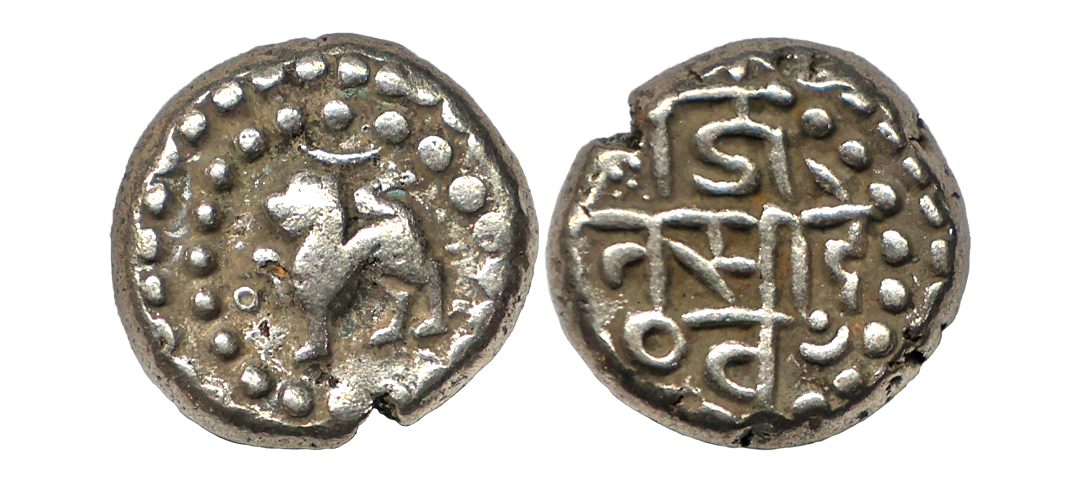 Medieval, Chauhans Of Ranthambor, King Jaitra Simha (c. 1275 AD), Silver Dramma, 4.26 gms, Obv. Lion standing left, forepaw raised; flanked by sun and moon Rev. Nagari legend Jai/ta Si de/va; all within a circle of dots, Deyell # 366, very fine+, scarce.