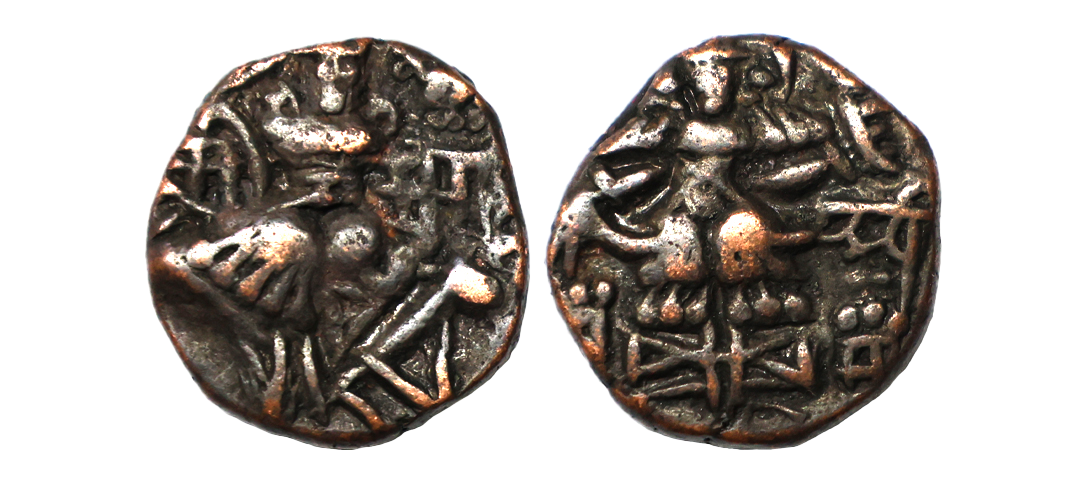 Hindu Rulers of Medieval Kashmir, Utpala Dynasty, Shankaravarman (884-903 AD),, Copper Drachm, 6.29 gms, Obv. Goddess Lakshmi seated facing Nagari legends, Rev. King standing facing and sacrificing with his right hand over altar, about very fine, scarce.