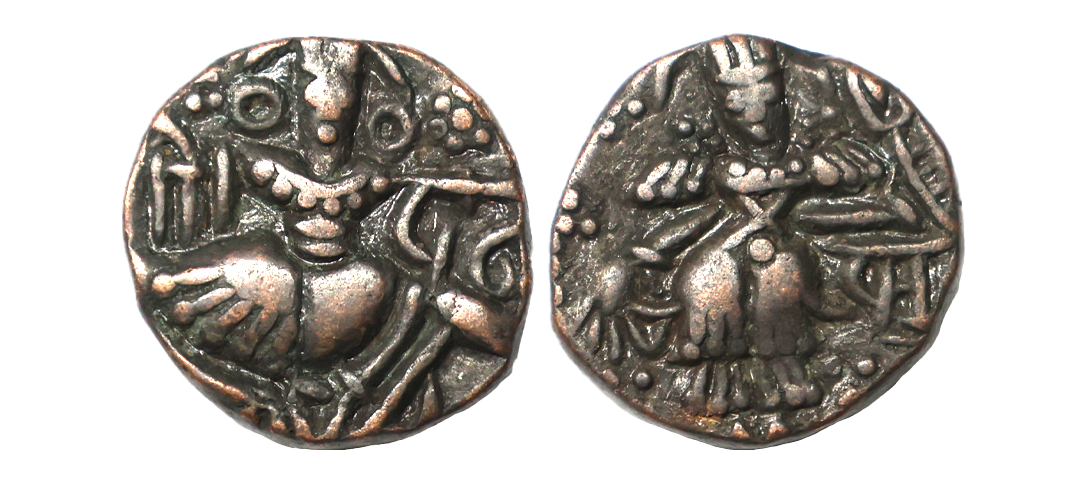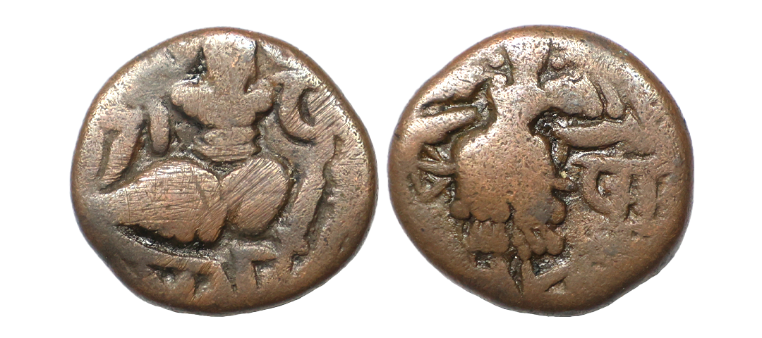 Hindu Rulers of Medieval Kashmir, Second lohara Dynasty, Nirjjita/Anirjjita Varman (906/908 AD), Copper Drachm, 5.97 gms, Obv. Goddess Lakshmi seated facing Nagari legends ‘Ani’, Rev. King standing facing and sacrificing with his right hand over altar with nagari legends ‘Rjjita’, Unlisted, extremely fine, extremely rare.