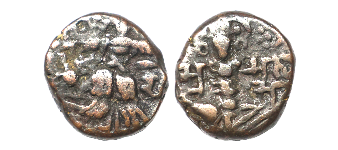Hindu Rulers of Medieval Kashmir, First lohara Dynasty, Harsha Raja Deva (1090-1102 AD), Copper Drachm, 6.06 gms, Obv. Goddess Lakshmi seated facing Nagari legends ‘Harsha Raja’, Rev. King standing facing and sacrificing with his right hand over altar with nagari legends ‘Deva’, MNI #188-189, very fine, very scarce.