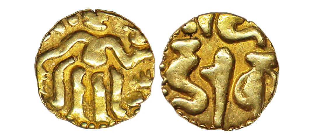 Hindu Rulers of Medieval Kashmir, Second lohara Dynasty, Jaga deva (1198-1213 AD), Copper Drachm, 6.10 gms, Obv. Goddess Lakshmi seated facing Nagari legends ‘JaGa’, Rev. King standing facing and sacrificing with his right hand over altar with nagari legends ‘Deva’, MNI #193-194, extremely fine, very scarce.