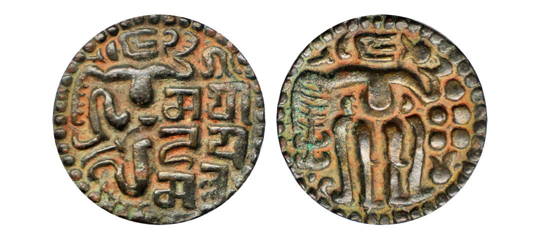 Hindu Medieval, Medieval Ceylon, Sahasa Malla (1200-1202 AD), Copper Malla Unit, 3.84 gms, Obv. King seated right, with left arm raised Nagari legend below arm: Sri/mat Sa/hasa/ Mala, Rev. Standing king in centre, with lamp at left and globes at right, very fine, very scarce.