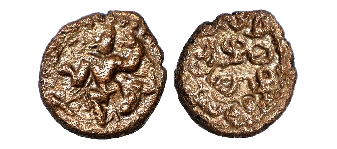 Medieval, Banas of Madurai (14th-15th Century CE), Copper Kasu, 2.96 gms, Obv. a stylized Garuda running to the left, holding a serpent in the right hand, Rev. tamil script, fine+, scarce.