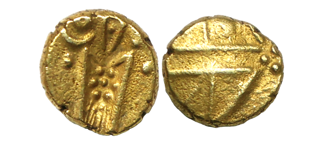 Medieval, Vira Raya type, Anonymous issue (17th-18th Century AD), Gold Fanam, 0.33 gms, Obv. very crude representation of a Lion, Rev. Crude Legend, very fine, scarce.