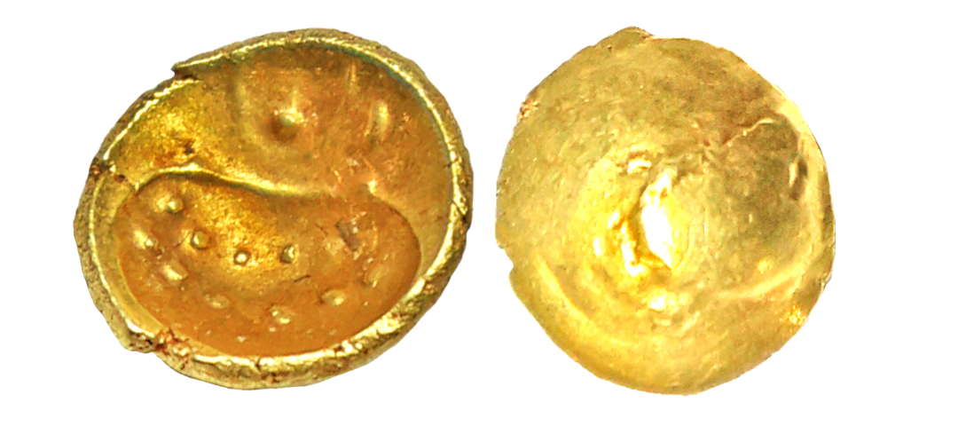 Medieval, Vira Raya type, Anonymous issue (c. 17th-18th Century AD), Gold Fanam, 0.37 gms, very crude representation of a Lion, Uniface, very fine, scarce.