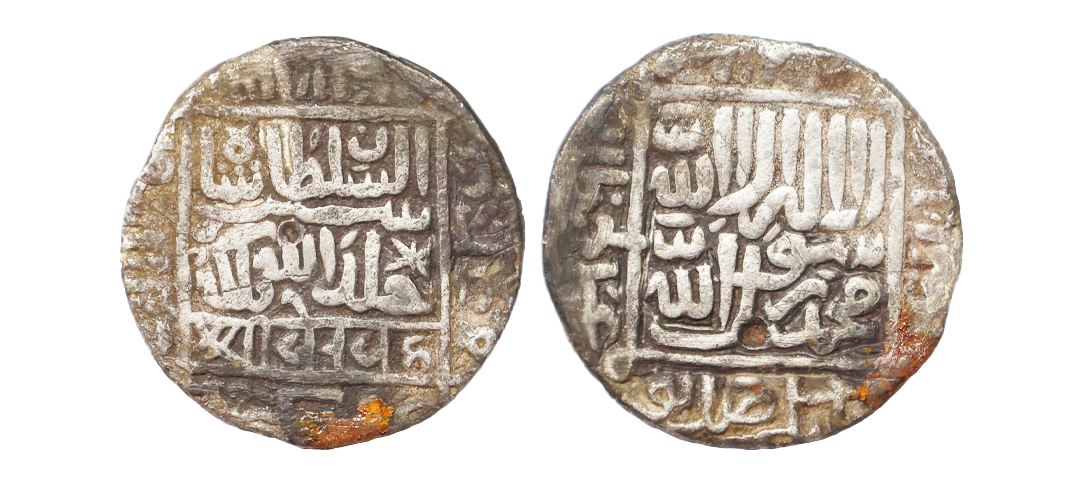 Delhi Sultan, Muhammad Bin Tughluq (AH 725-752, 1325-1351 AD), Silver Tanka, 11.04 gms, Dehli Mint, AH 741 read as ahadi wa arba'een wa sab'amiat, struck in the name of Caliph al-Mustakfi of Baghdad, Obv: fi zaman al-imam al-mustakfi billah amir al-mu'minin abu rabi' sulaiman khallada allah khilafatahu, Rev: duriba hadha al-dinar al-khalifati fi al-Delhi shahur followed by date in words, G&G #D430, very fine, very rare.