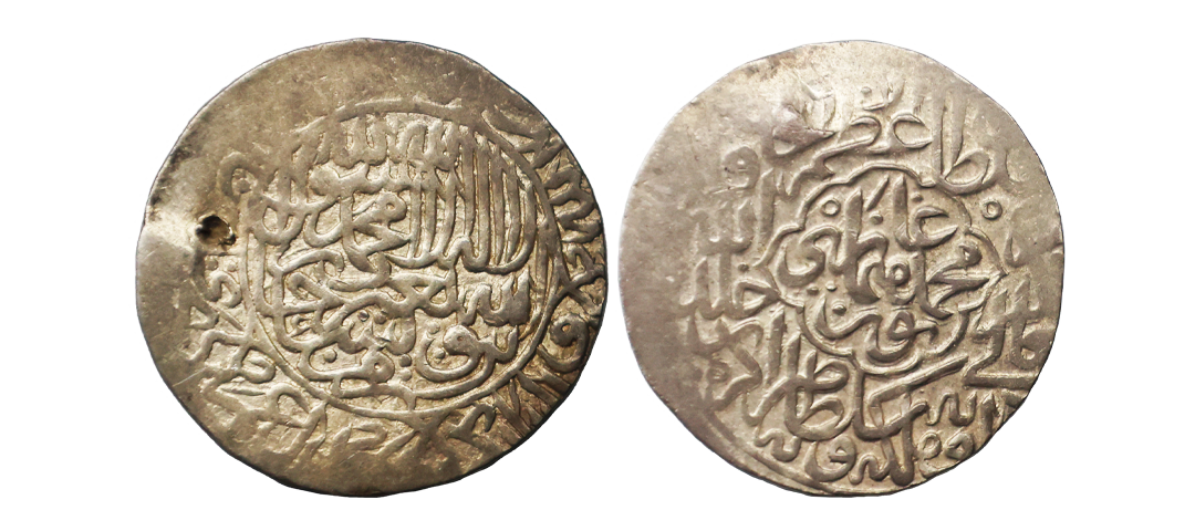 Humayun, First Reign (AH 937-947, 1530-1540 AD), Silver Shahrukhi, 4.63 gms, Agra Mint, ND, Obv. Muhammad Humayun Ghazi in the central cartouche surrounded by royal titles and mint-name, Rev. Shahadah with Quranic text 'yarzaqallah man yashao baghayr hisab', names and titles of the Rashidun around, very fine, very rare.