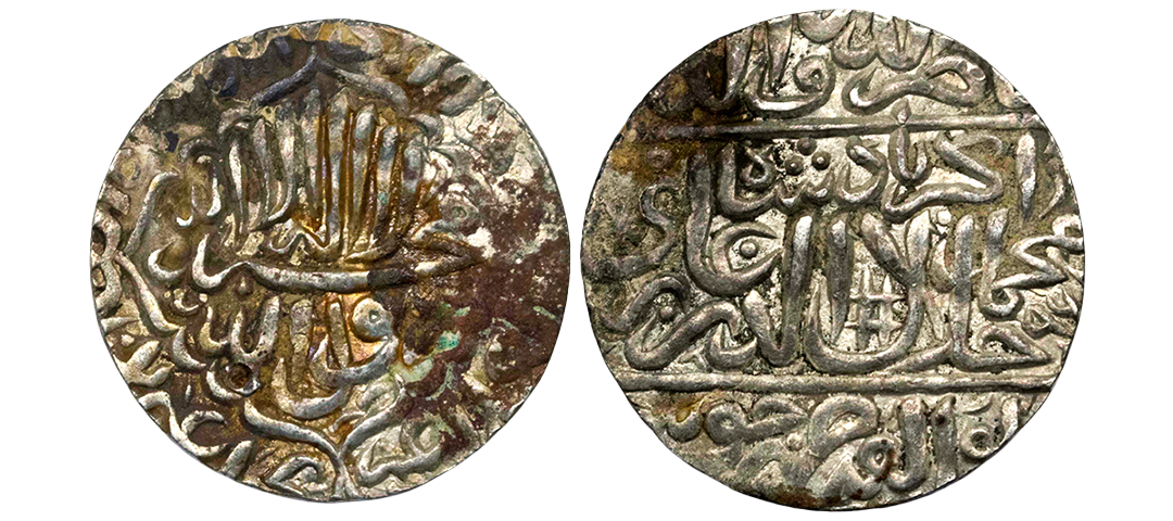 Akbar (AH 963-1014 / 1556-1605 AD), Silver Rupee, Big Flan, 11.52Grms, Dar-ul-khilafat Jaunpur Mint, AH 96X, Kalima within mihrab-shaped cartouche on obv. (KM # 80.10). Fine+.