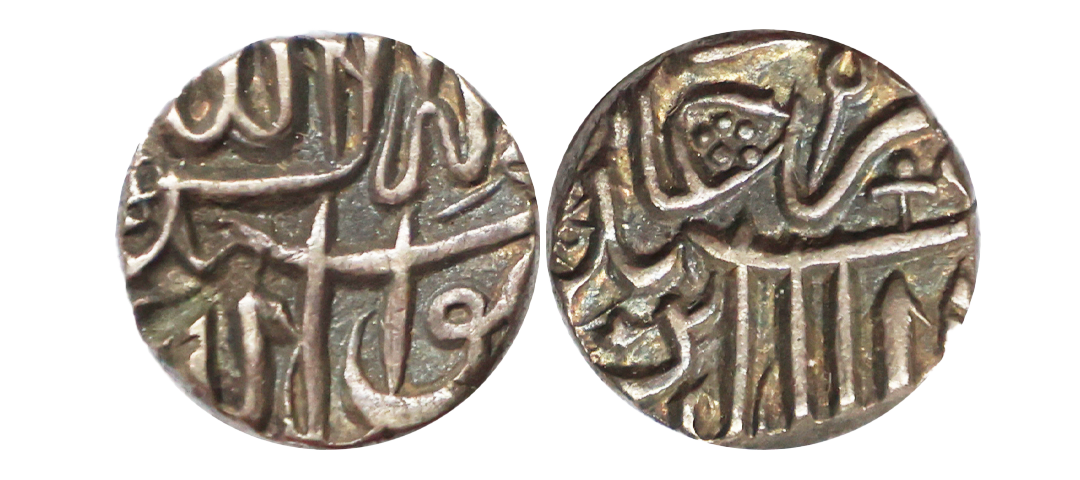 Akbar (AH 963-1014, 1556-1605 AD), Provincial issues, Silver ½ Mahmudi, 2.73 gms, Mulher Mint, struck by the Raja of Baglana State, mace like symbol on obverse, very fine, very scarce.