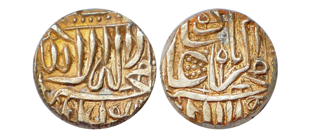 Akbar (AH 963-1014, 1556-1605 AD), Provincial issues, Silver Mahmudi, 5.56 gms, Mulher Mint, struck by the Raja of Baglana State, mace like symbol on obv., KM #72.1, very fine, very scarce.