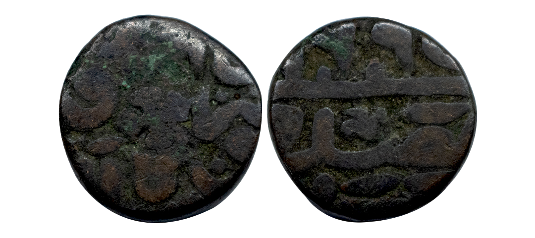 Akbar (AH 963-1014, 1556-1605 AD), Copper ½ Dam, 9.42 gms, Dar al-Khilafat Shahgarh urf Qanauj Mint, AH 969, “stephen cross" as a mint mark on rev, anti clockwise Swastika symbol on obv, very fine, rare.