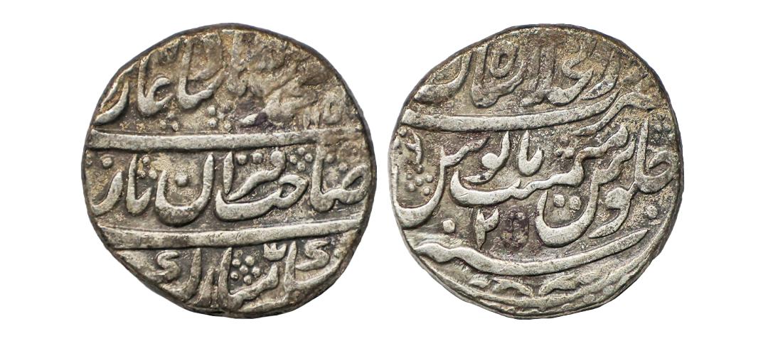 Muhammad Shah (AH 1131-1161, 1719-1748 AD), Silver Rupee, 11.44 gms, 22.09 mm, Dar-ul-Khilafat Shahjahanabad Mint, AH 115x, RY 25, KM # 437.4, about very fine, very scarce.