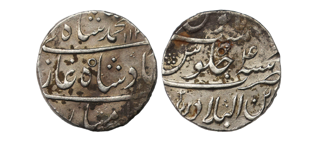 Muhammad Shah (AH 1131-1161, 1719-1748 AD), Silver Rupee, 11.58 gms, Zain al Bilad Mint, AH 113x, RY 4, KM #436.63 very fine, rare.