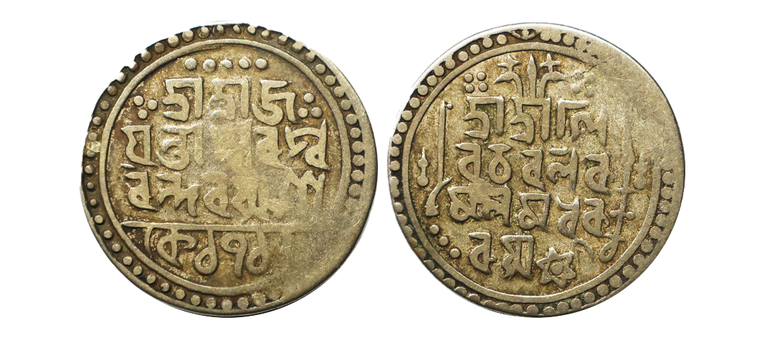 Jaintiapur, Bar Gossain II (SE 1653-1692 / 1731-1770 AD), Silver Rupee, 8.86g, SE 1653, Obv: Sri Sri Si / va Charana Ka / mala Madhu Ka / rasya (Six-pointed star), Rev: Sri Sri Ja / yantipura Pu / randarasya Sa / ke 1653. (R&B # K8d).