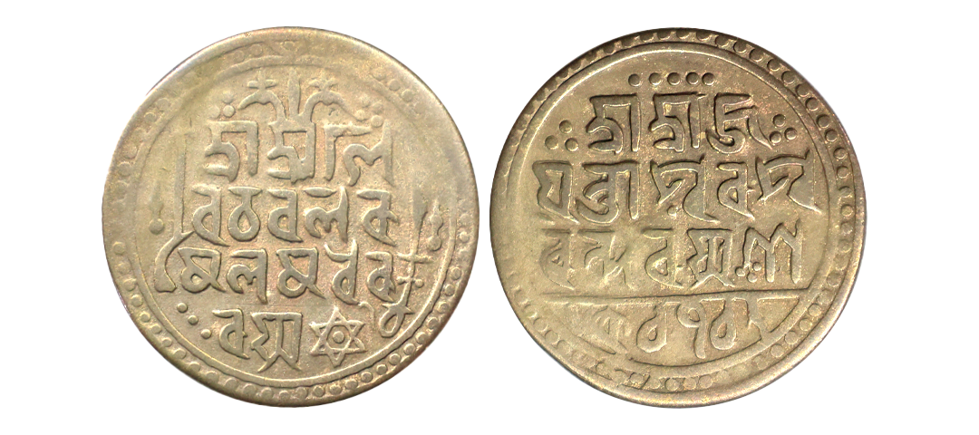 Jaintiapur, Bar Gossain II (SE 1653-1692 / 1731-1770 AD), Silver Rupee, 8.86g, SE 1653, Obv: Sri Sri Si / va Charana Ka / mala Madhu Ka / rasya (Six-pointed star), Rev: Sri Sri Ja / yantipura Pu / randarasya Sa / ke 1653. (R&B # K8d).