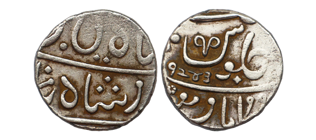 Maratha Confideracy, INO Shah Ali Gohar (AH 1174-1221, 1759-1806 AD), Silver Rupee, 11.34 gms, Poona Mint, FE 1243, KM #325, very fine, scarce.