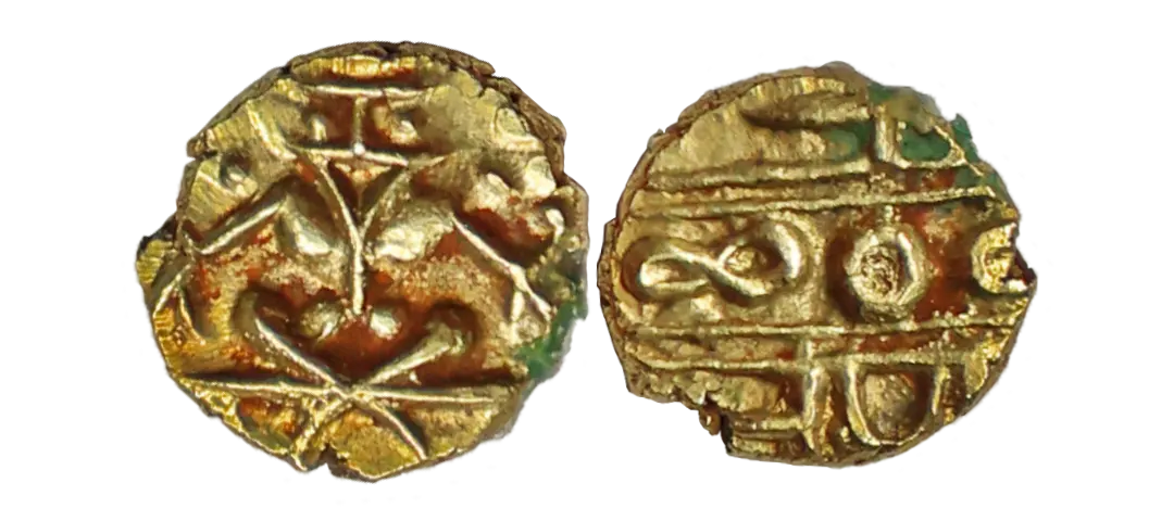 Mysore Kingdom, Kanthirava Narasaraja Wadiyar I (1638-1659 AD), Gold Fanam, 0.39 gms, Obv. Narasimha in the Yogabhanda pose holding a chakra and a Sankh, Rev. Nagari legend 'Sri/Kamthi/Rava', Herrli #6.04.11, very fine, very scarce.