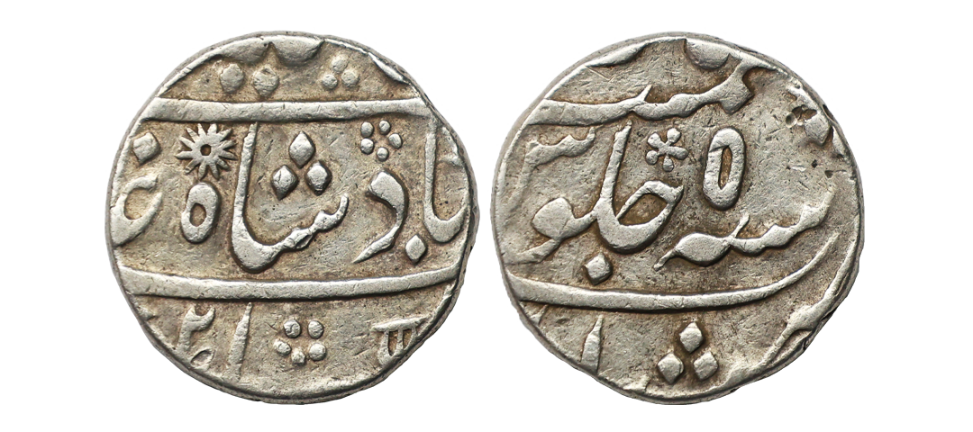 Nawabs of Bengal Alamgir II (AH 1167-1173 / 1754-1759 AD), Silver Rupee, 11.43g, Azimabad (Patna) Mint, AH 1173, RY 6, Trident symbol on rev and mint name on top off flan. (KM # 460.5). Very Fine.