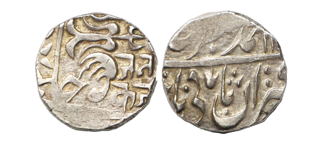 Gwalior State, Ajit Singh (AH 1235-1274, 1819-1857 AD), Silver Rupee, 10.47 gms, Bajranggarh Mint, Nagari legend on both sides, Bow & Arrow, lotus as a mint mark, KM # 16, very fine, very scarce.
