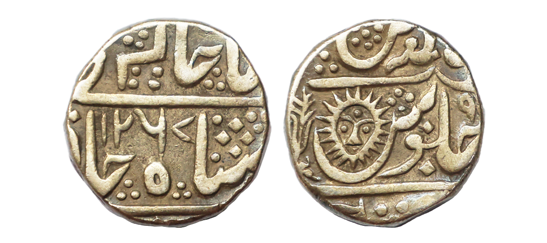Indore State, INO Shah Alam II (AH 1174-1221, 1759-1806 AD), Copper 1/2 Anna, 12.76 gms, 22.08 mm, AH 1286, Malharnagar Mint, Obv. Nandi Bull reclining in front of Shiva Linga, Rev. Bilva leaf, KM # 68, very fine, very scarce.