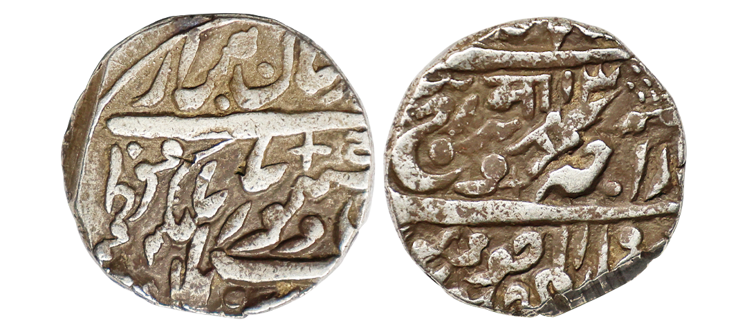 Jodhpur State, Takhat Singh (AH 1259-1290, 1843-1873 AD), INO Shah Alam II, Silver Rupee, 11.37 gms, Dar al-Mansur Jodhpur Mint, INO Queen Victoria, Nagri initials ‘Ma’ with a Katar on reverse, very fine, very scarce.