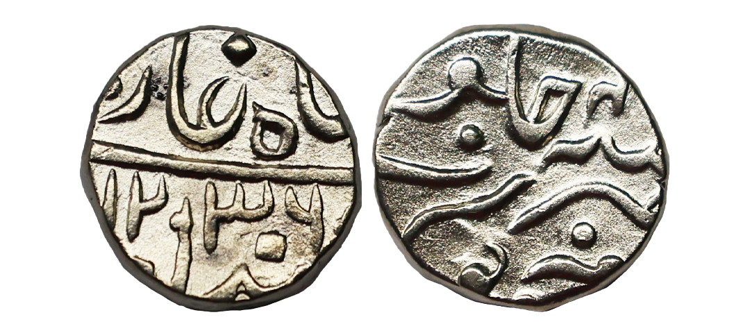 Patiala State, Rajinder Singh (VS 1933-1957, 1876-1900), INO Ahmed Shah Durrani (AH 1160-1186, 1747-1772 AD), Silver Rupee, 10.96 gms, VS (19)42, Dagger (Katar) Symbol in the left of julus, KM # Y6, about very fine, very scarce.
