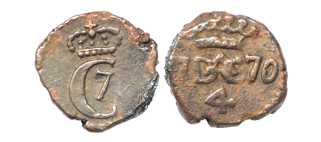 Indo Danish, Christian VII (1766-1808 AD), Copper 4 Cash, 2.10 gms, 1770 AD, Obv. Crowned C7 monogram, Rev: crowned DAC with date & value below, KM #154.1, fine+, very scarce.