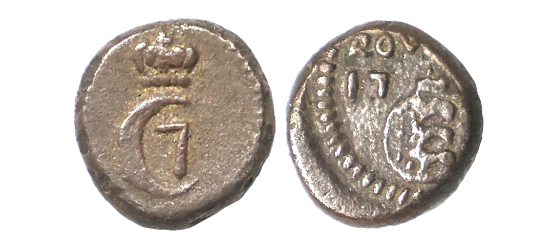 Indo Danish, Christian VII (1766-1808 AD), Silver Royallin, 1.26 gms, 1770 AD, Obv. Crowned C7 monogram, Rev: Danish crown with date across & value above, KM #168, very fine, rare.
