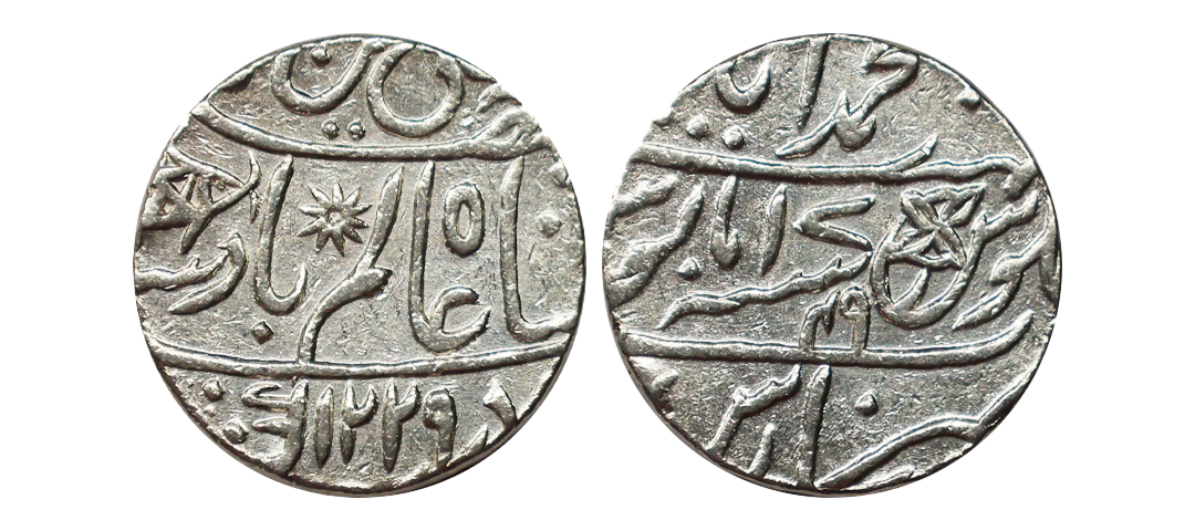 Bengal Presidency, INO Shah Alam II (AH 1174-1221, 1759-1806 AD), Silver Rupee, 11.30 gms, Muhammadabad Banaras Mint, AH 1229, RY 17/49, KM # 40.1, very fine+, scarce.