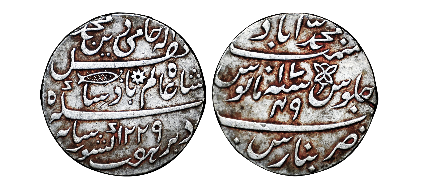 Bengal Presidency, Muhammadabad Banaras Mint, Silver Rupee, 11.44 gms, AH 1229, RY 17/49, In the name of Shah Alam II, KM # 42, very fine+, very scarce.