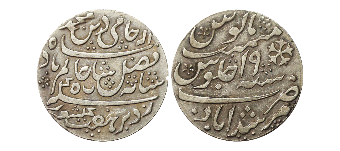 Bengal Presidency, INO Shah Alam II (AH 1174-1221, 1759-1806 AD), Silver Rupee, 11.64 gms, Murshidabad Mint, RY 19, plane edge, KM # 77, very fine, scarce.