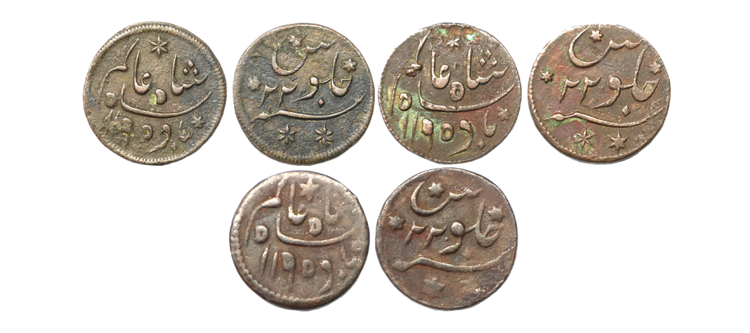Bengal Presidency Princep’s Coinage, Set of 3 coins, INO Shah Alam II (AH 1174-1221, 1759-1806 AD), Copper ½ , 1/8, 1/16, Anna, 13.85 gms, Princep Issue, Falta Mint, AH 1195, RY 22, KM # 127, 3.64 gms, Princep Issue, Falta Mint, AH 1195, RY 22,1.70 gms, Princep Issue, Falta Mint, AH 1195, RY 22, very fine, very scarce.