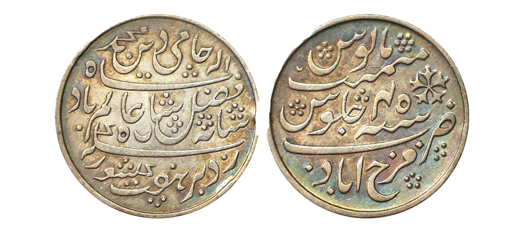 Bengal Presidency, INO Shah Alam II (AH 1174-1221, 1759-1806 AD), Silver Rupee, 11.62 gms, Farrukhabad Mint, RY 45, plane edge, KM # 77, very fine, scarce.