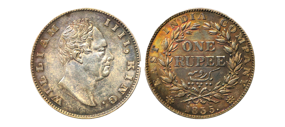 William IIII, Silver Rupee, 1835, Calcutta Mint, "F." Incuse, Obv. A, Rev. II, With Bud Leaf, 5 Over 5 On Date, XF.