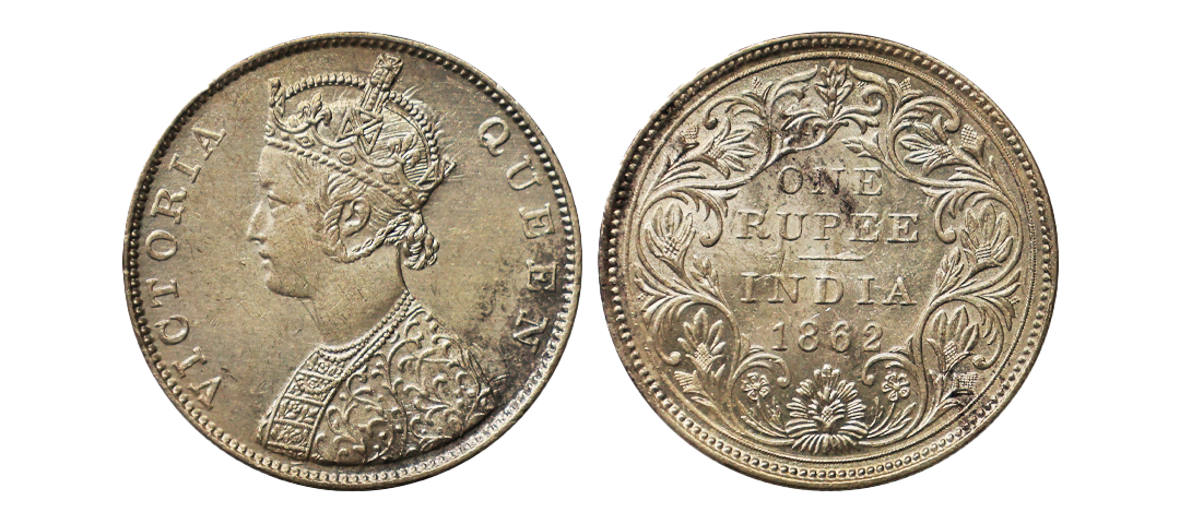 Victoria Queen, 1862, Silver Rupee, AII, 1/2 dots, struck on earlier used dies, Very high grade specimen, choice quality, Rare variety.