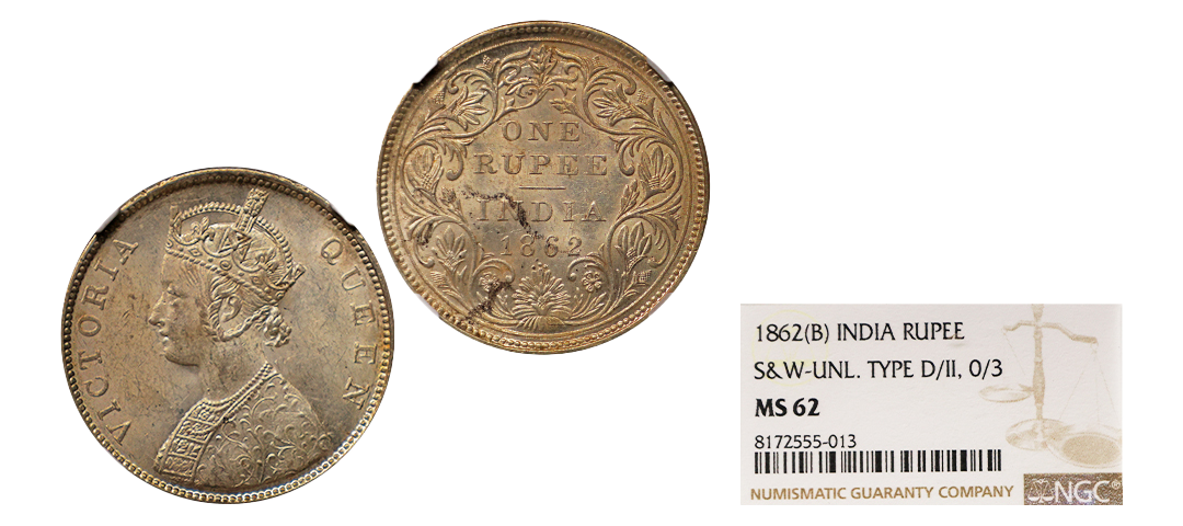 Victoria Queen, 1862, Silver Rupee, B/II, pointed tips of bottom flower ornate, Numeral '2' in '1862' is reengraved on earlier digit, Very Rare.