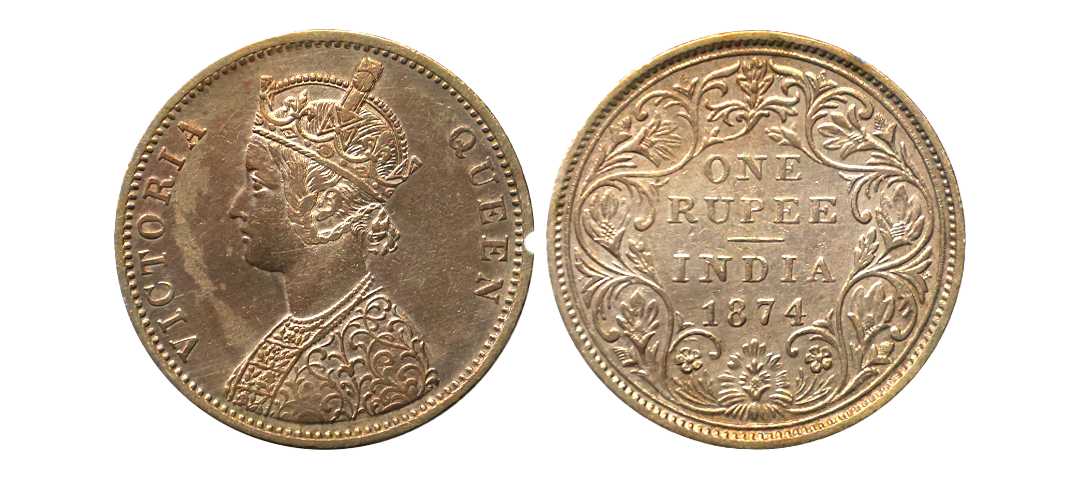 Victoria Queen, Silver Rupee, 1874, A/II, No Dot, Bombay Mint, complete base line raised at the bottom of the bust on Obverse, Extremely Rare Variety.