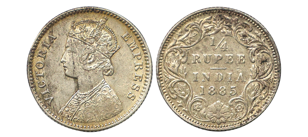 Victoria Empress, Silver 1/4 Rupee, 1885, Bombay Mint, B Raised, Extra Fine+, Rare.
