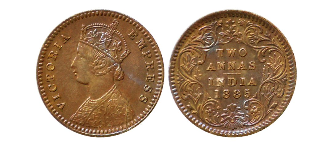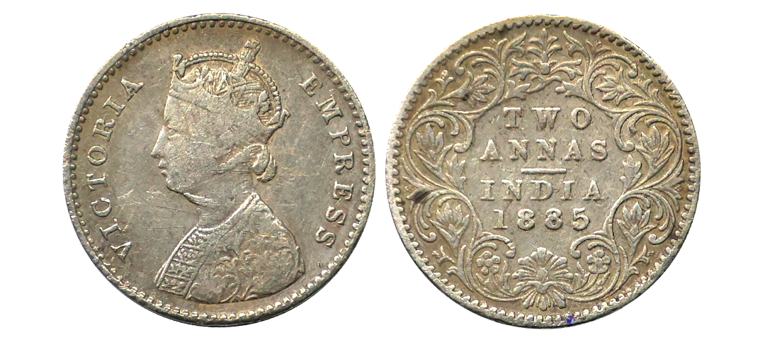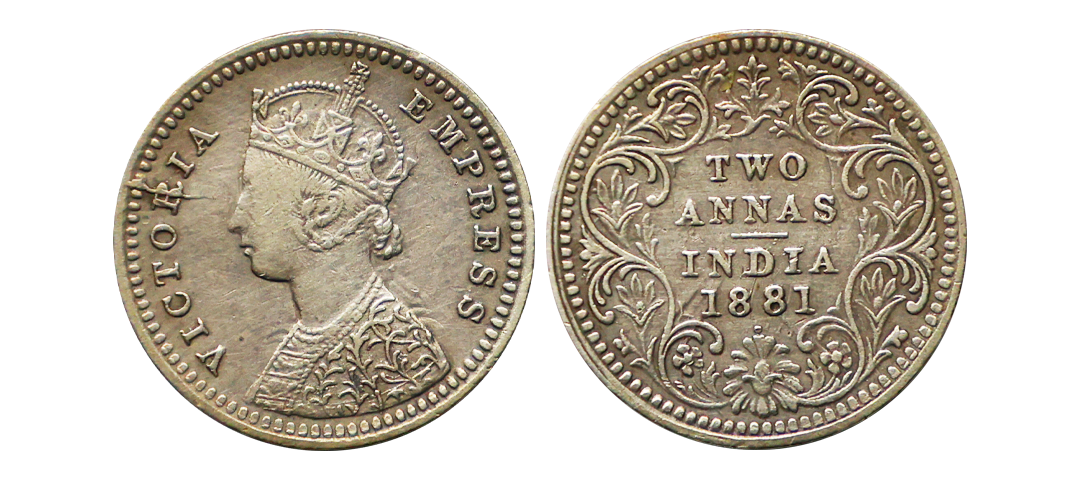 Victoria Empress, Silver 2 Annas, 1880, Calcutta Mint, C incuse, About Extremely Fine, Toned, Very Rare.