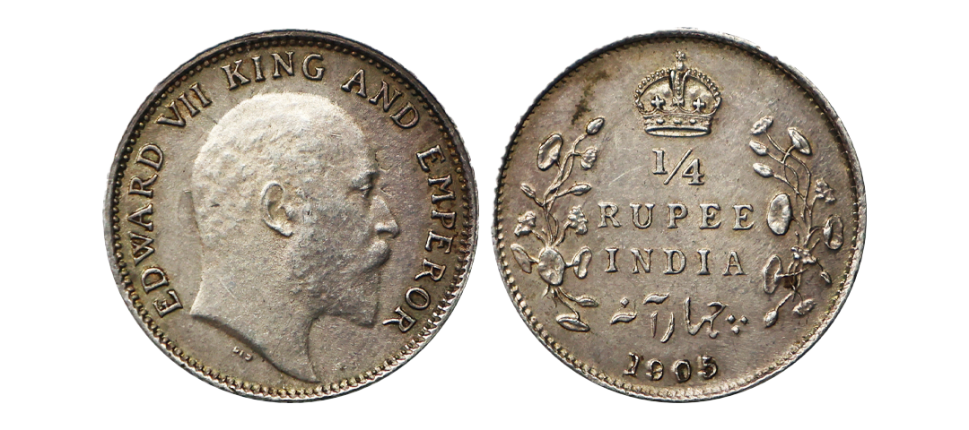 Edward VII, Silver 1/4 Rupee, 1905, Wavy And Broken Date Error, Calcutta Mint, XF, Rare.