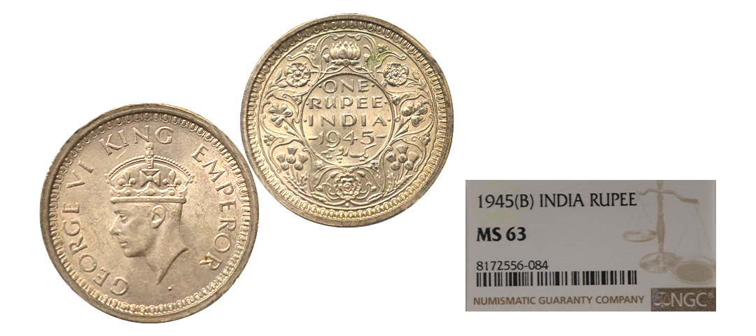 George VI, 1944, Silver Rupee, Bombay mint, The coin features excellent smooth surfaces with satiny appearance, very attractive, Graded by NGC as MS63, Very rare