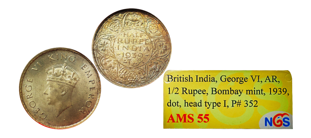 George VI , Silver 1/2 Rupee, 1939, Bombay Mint, Young Head, Graded By NGS AMS55, (According to our opinion this coin is BUNC how ever the third party has mention grade as "AMS55" ).