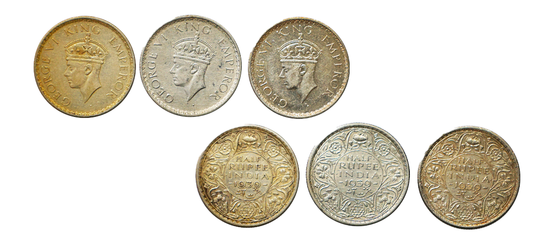 George VI , Set of 3 Coins, Silver 1/2 Rupee, 1939, Matured Head, Calcutta Mint, VF+, Scarce.